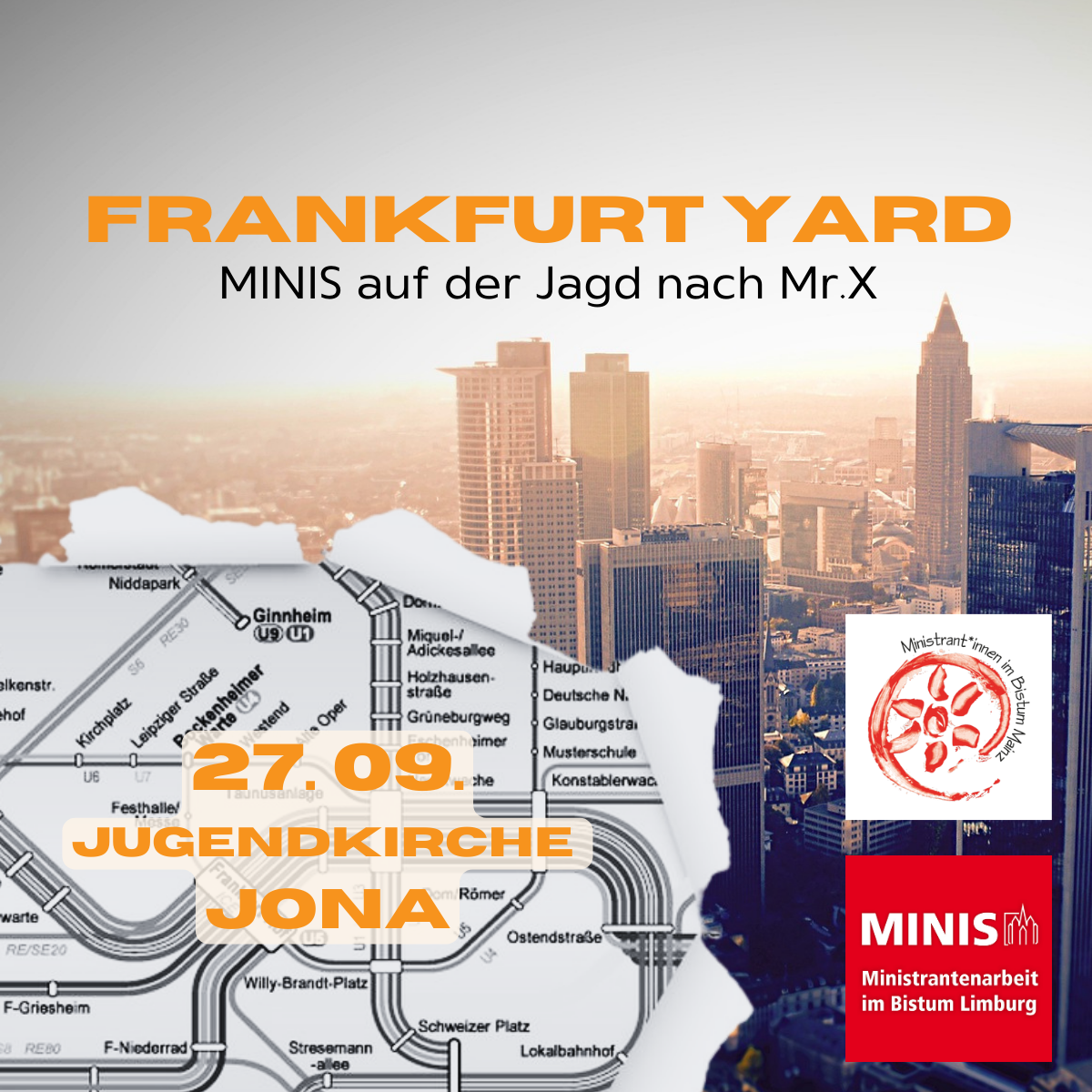 Mit den und gegen die Minis aus dem Bistum Mainz machen sich Gruppen aus dem Bistum Limburg in Frankfurt auf die Jagd nach Mr. X. Mit Bus, Straßen- U- und S- Bahn geht es kreuz und quer durch Frankfurt, immer den Tipps aus der Agentenzentrale hinterher. Wir starten dazu an der Jugendkirche JONA, in der wir zum Abschluss auch gemeinsam Gottesdienst feiern.